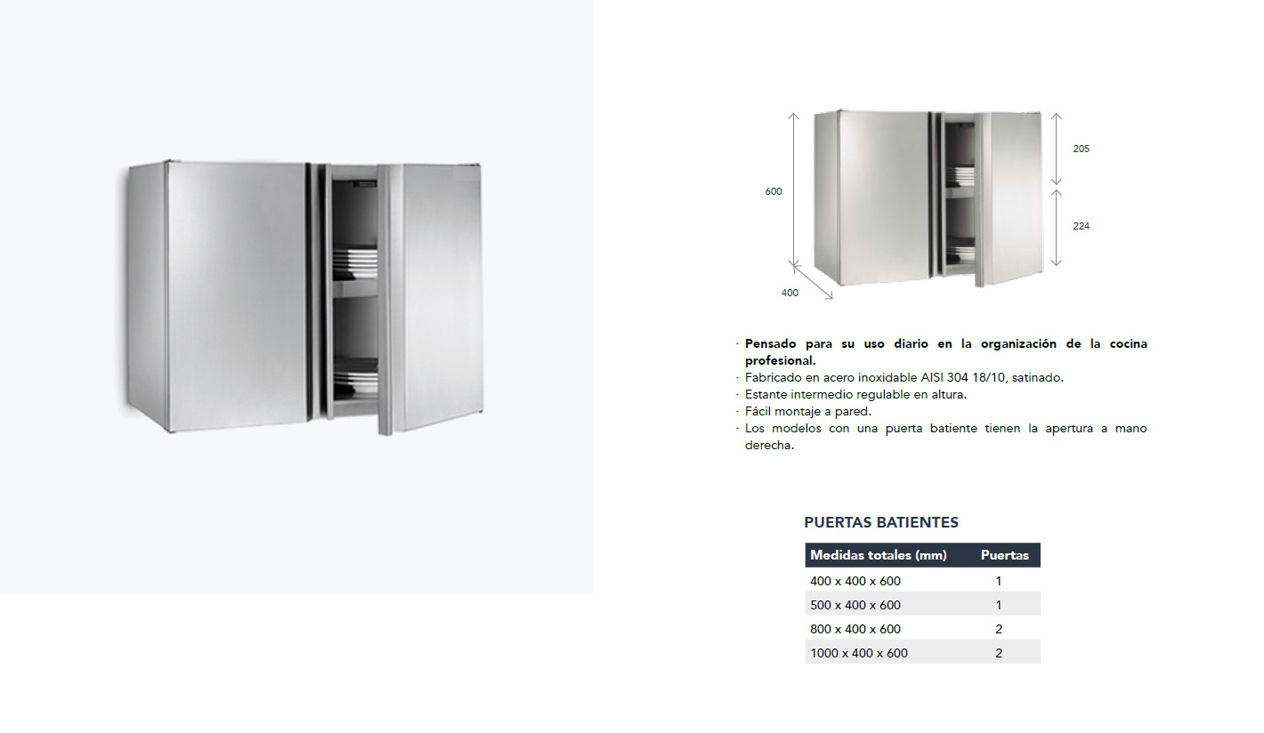 Armario acero inox de pared con varios anchos. Fabricado con acero inoxidable, ideal para cocinas profesionales por durabilidad y resistencia.
