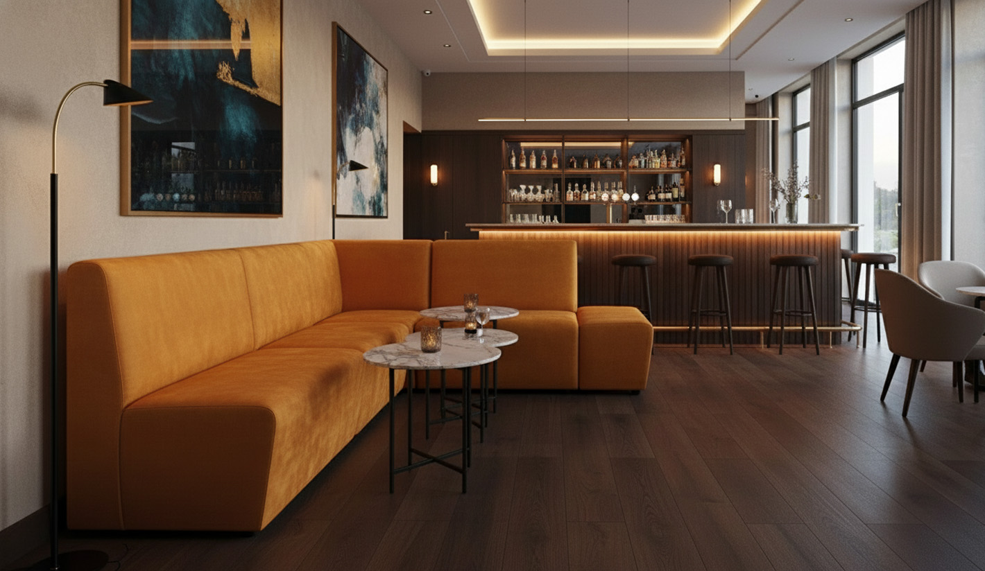 Bancada tapizada lisa en varias telas. El acabado de la bancada lisa lleva las minimas costuras posibles.