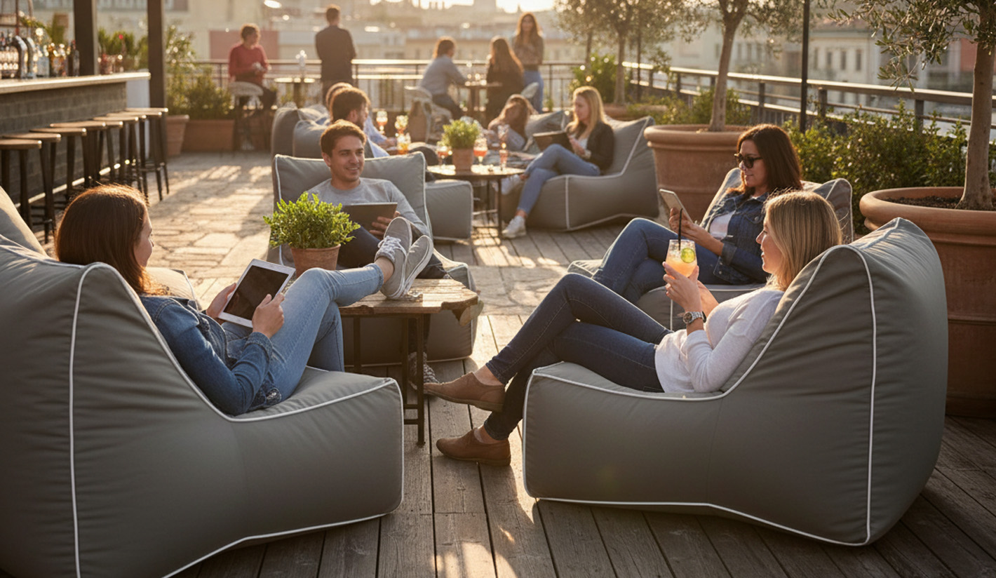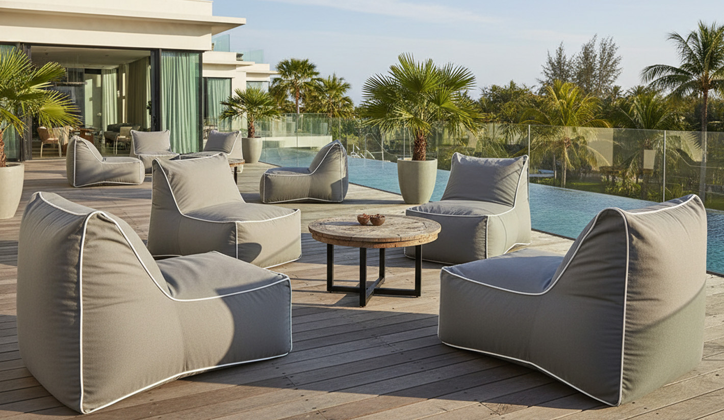 Con su estética moderna y volúmenes suaves, este puff es perfecto para crear ambientes sofisticados tanto en piscinas, terrazas, hoteles boutique, rooftops y jardines de uso profesional. Su ligereza permite moverlo con facilidad y reorganizar el espacio según las necesidades del negocio.