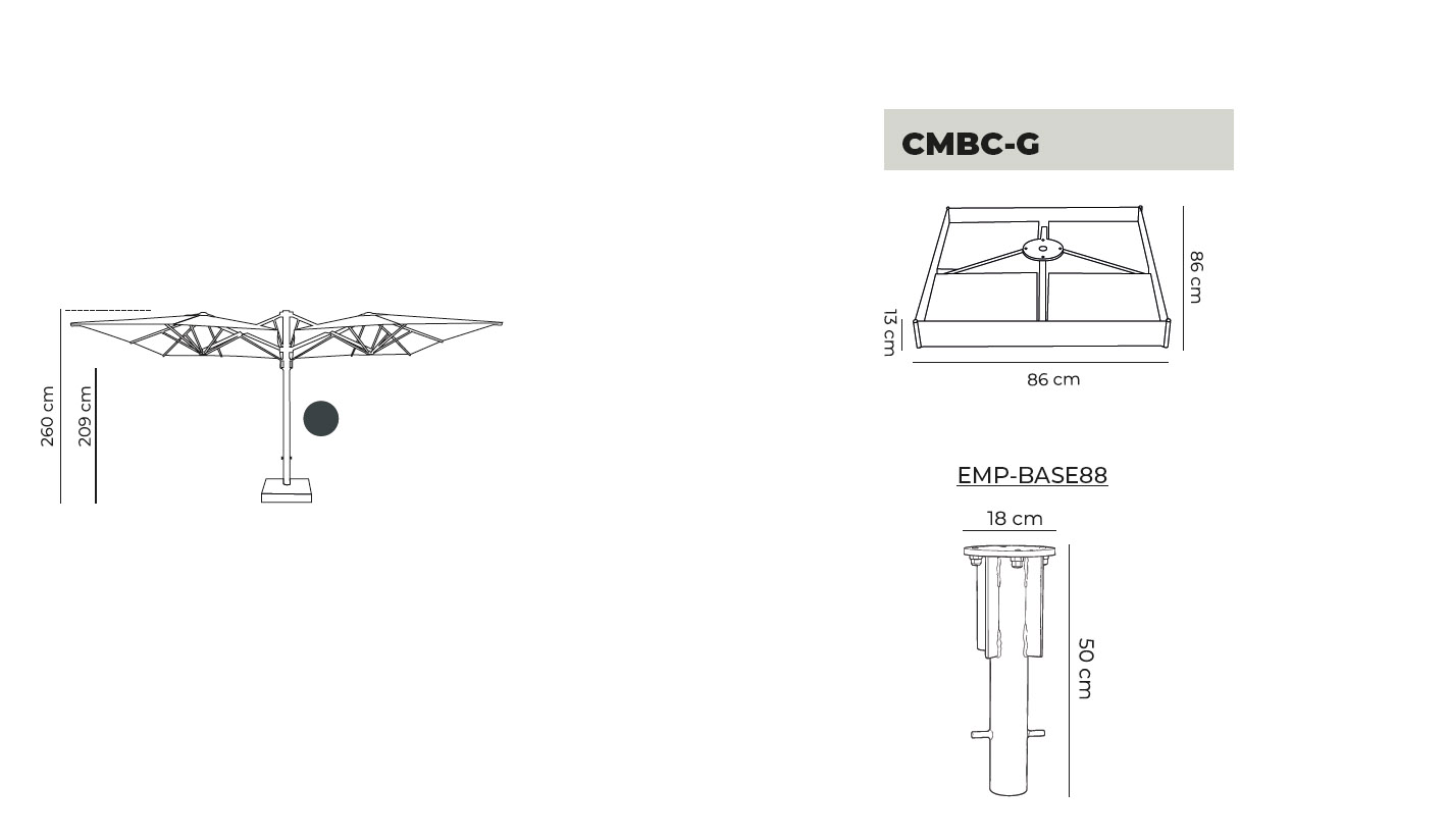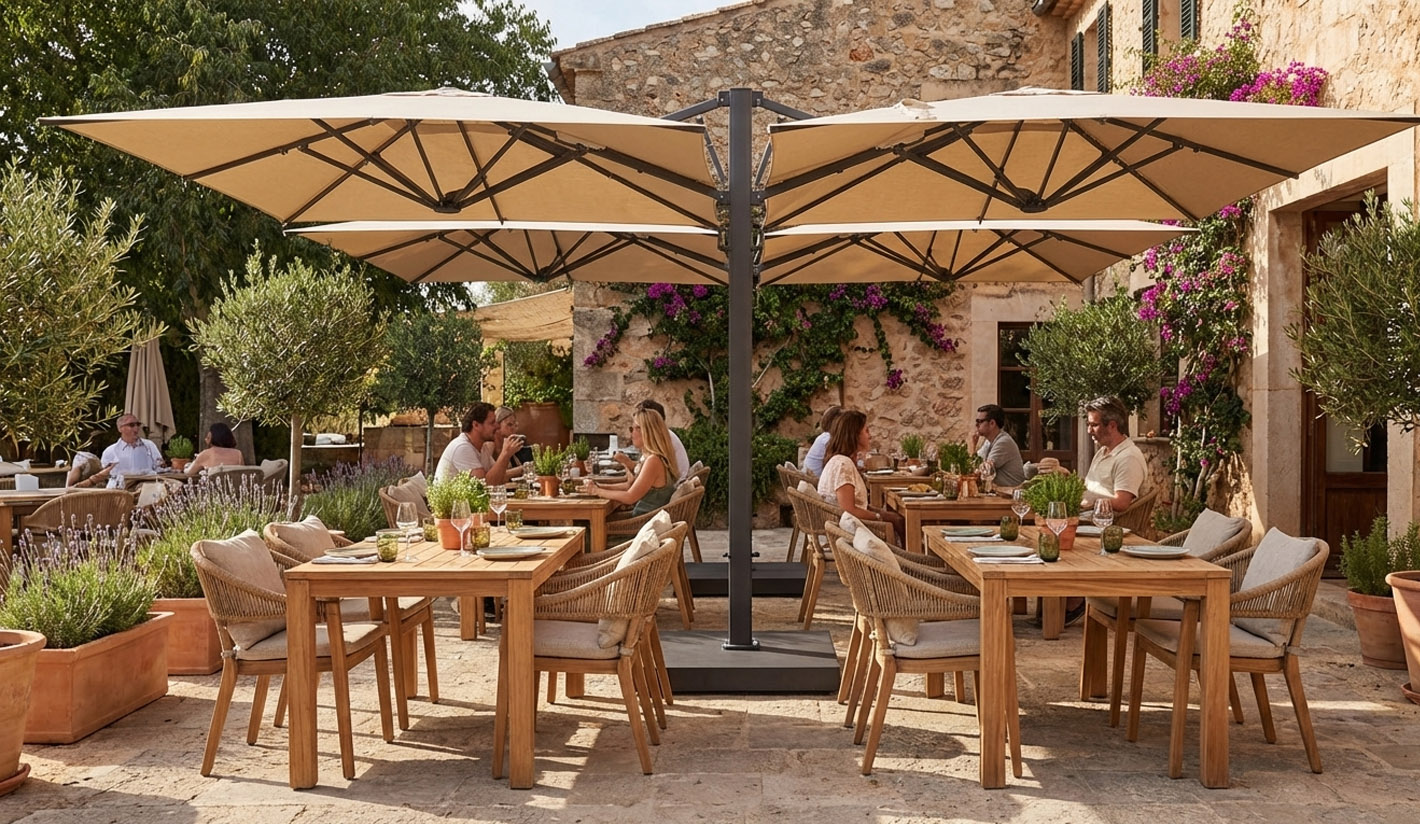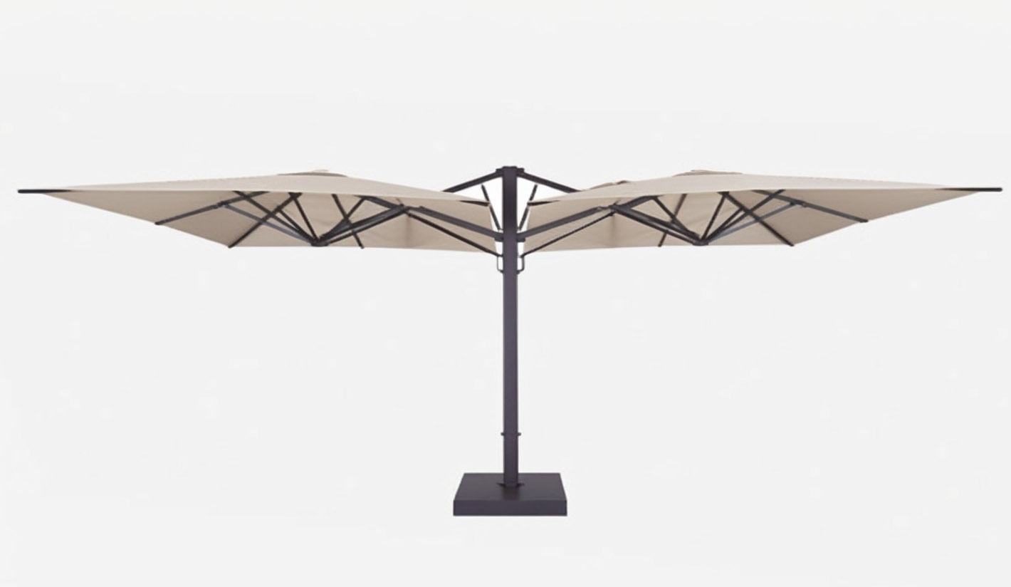 Parasol profesional de gran formato, especialmente diseñado para terrazas de hostelería que necesitan una amplia superficie de sombra, una imagen elegante y una solución preparada para un uso intensivo en exterior. Su diseño lateral con doble cubierta permite proteger de forma eficaz mesas corridas, zonas de comedor, espacios lounge o áreas de descanso, optimizando al máximo el espacio disponible.