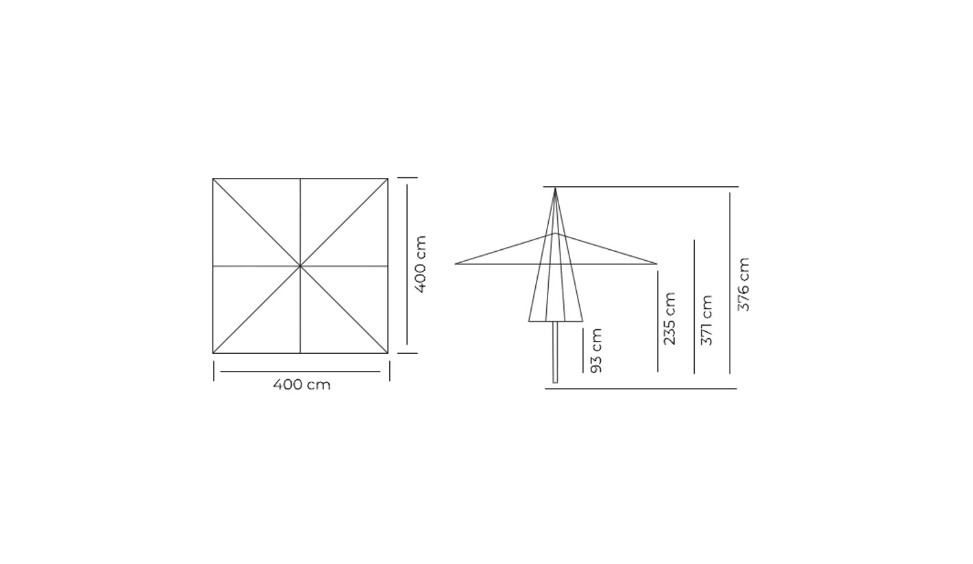 Su estructura cuadrada de 4x4 metros ofrece una amplia zona de sombra continua, perfecta para cubrir varias mesas o áreas lounge, mientras que su mástil de aluminio reforzado (71x71 mm) y sus varillas de 20x35 mm garantizan resistencia máxima y estabilidad duradera incluso en condiciones de viento.