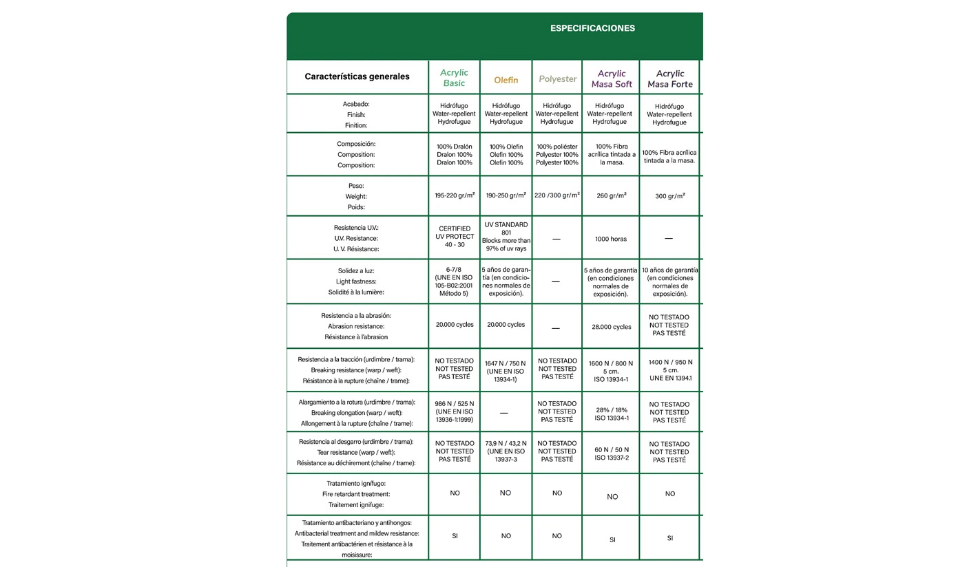 Tejido premium, recomendado para entornos con exposición solar intensa.