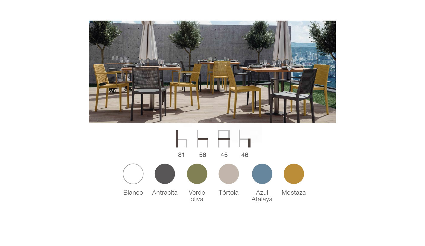 Esta silla con brazos es ligera, apilable y muy práctica para la gestión del espacio en negocios de hostelería. Resiste la humedad, los rayos UV y los cambios de temperatura, lo que la convierte en una opción excelente tanto para interiores como para exteriores, terrazas y zonas al aire libre.