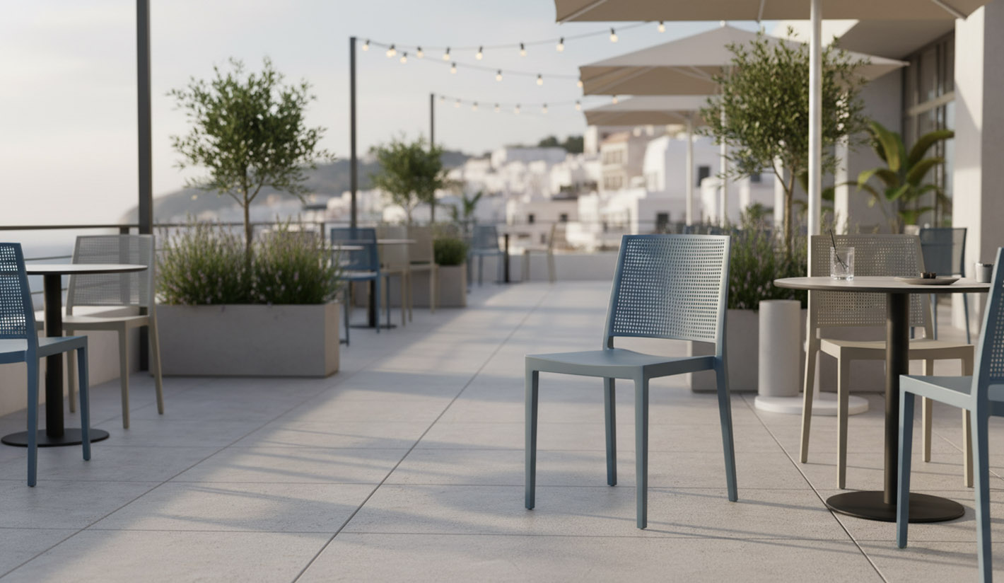 Silla de hostelería y restauración fabricada en polipropileno de alta resistencia, diseñada para un uso intensivo tanto en interiores como en exteriores. Su estructura monobloque garantiza estabilidad, durabilidad y fácil mantenimiento, características clave para bares, restaurantes, cafeterías y terrazas profesionales.