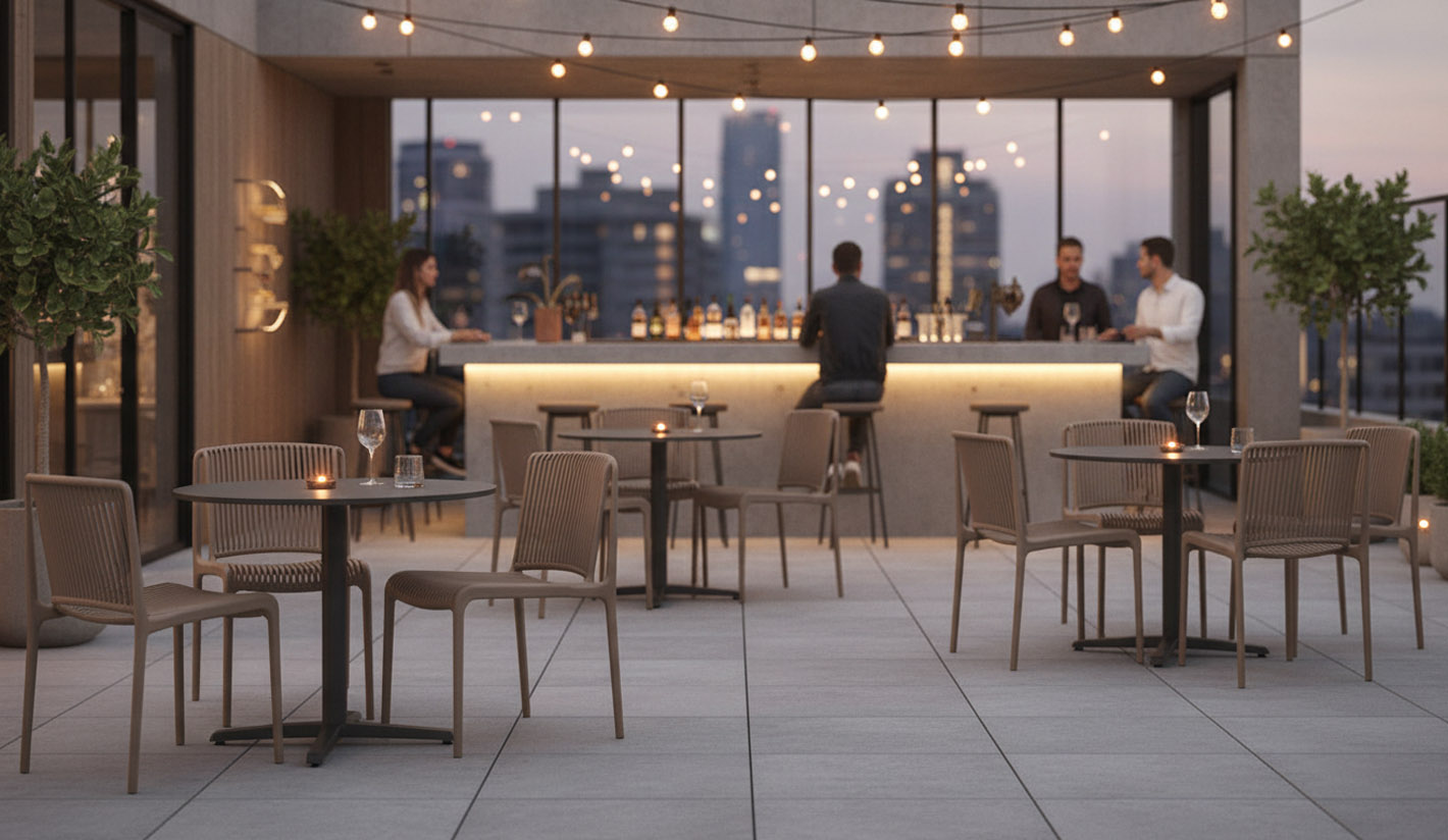 Silla profesional para hostelería, restauración y espacios HORECA, fabricada en polipropileno de alta resistencia, diseñada para ofrecer mayor confort y estabilidad en entornos de uso intensivo como bares, restaurantes, cafeterías y hoteles.